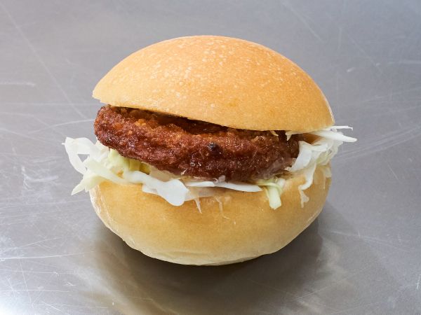 「唐津名物魚ロッケサンド」330円 唐津と言えば唐津くんちと名物魚ロッケ!高田屋のコロッケサンドは魚ロッケサンド。たっぷりのキャベツと一緒にどうぞ。