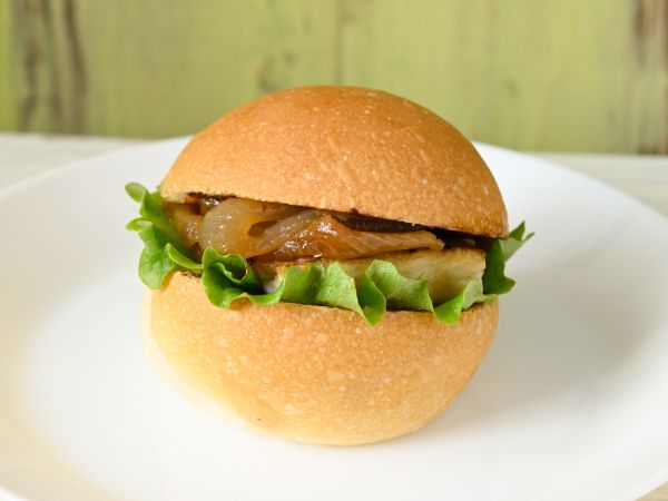 どれもおいしそうで迷います!数ある中から私が選んだのは、店長の日渡好美さんおすすめの「サバのバルサミコソテーとグリルオニオンサンド」(450円)。じっくり火をいれて酸味を飛ばしたバルサミコソースでソテーしたサバのバーガーです。食べてみるとサバの臭みはなく、パンに合う!美味しい!ボリュームがあるのにペロッと食べちゃいました。