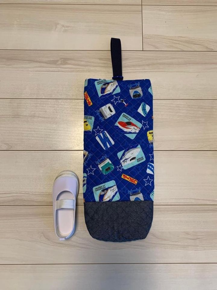 青地に新幹線のイラストが描かれたかっこいい上履き入れですが、隣に並ぶ上履きの倍以上の長さ。2枚目の写真ではネギを並べていますが、大変しっくりくる長さです。どでかみんストロングさんは「裁縫に不慣れでサイズを間違えてしまった」といいますが、上下で無地と柄を分け、取っ手も持ちやすい素材でついている、母の愛たっぷりの上履き入れです。