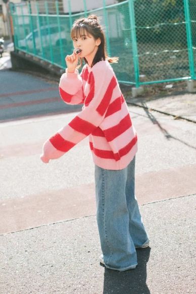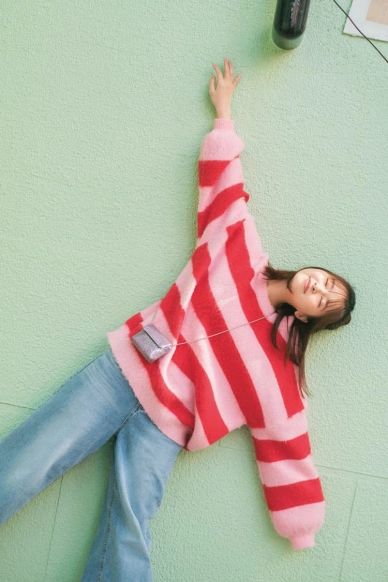 ピンクボーダーニット 16,500円、デニムパンツ 15,950円/ともにAMAIL バッグ 7,480円/キャセリーニ スニーカー 8,250円/コンバース