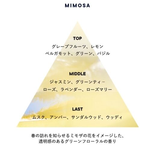 古くからヨーロッパでは春の訪れを告げる花として知られている、黄色く小さな丸い花が可憐な”ミモザ”。透明感のあるグリーンフローラルな香りで表現され、ふと香りを感じた瞬間に、あたたかくやわらかな陽だまりや、やさしくそよぐ爽やかな風、芽吹いたばかりの草花が揺れる音など、さまざまな春の情景が浮かんできます。