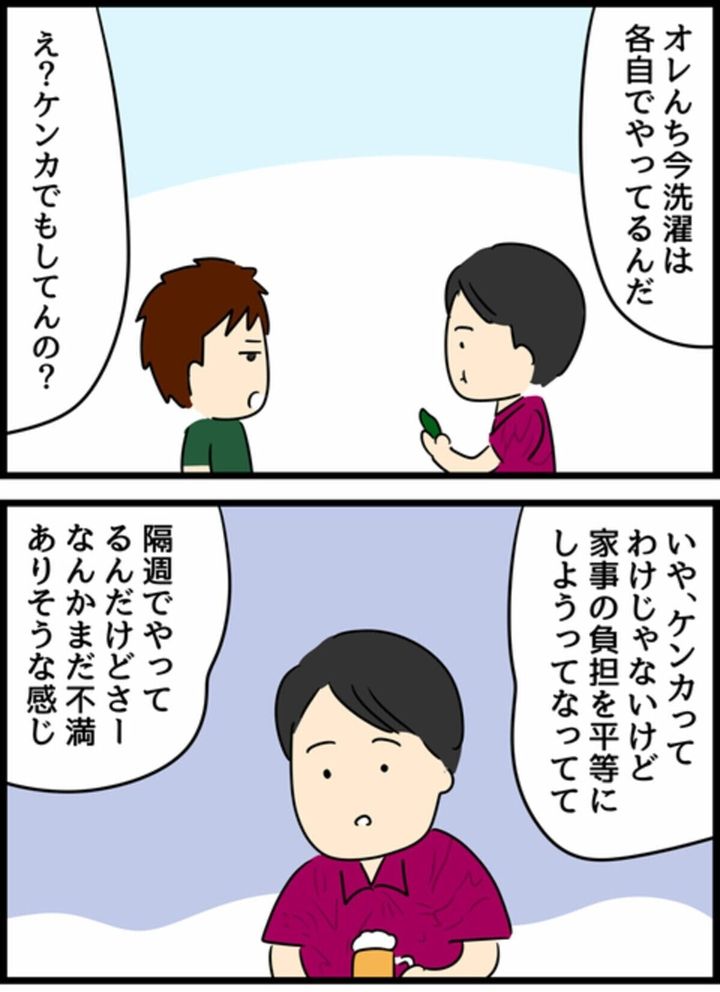 共働き夫婦で、お互いを「エムコちゃん」「エスオ君」と呼び合う2人の日常のお話。エムコちゃんとエスオ君は、家事のやり方で意見が合わず、すれ違い気味。自分のことは各自でやり、共有スペースは当番制を取り入れたのですが、モヤモヤは解決せず。そんな2人は休日に、それぞれの友人と過ごします。エスオ君は友人とどんな話をするのでしょう?夫婦の日常に起こるモヤモヤを双方の視点で描いた、人間まお(@ageomao)さんの作品をお読みください。