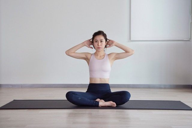 (1)床にあぐらで座って背筋を真っ直ぐ伸ばして骨盤を立て、お腹に力を入れて両手を頭の後ろにセットする