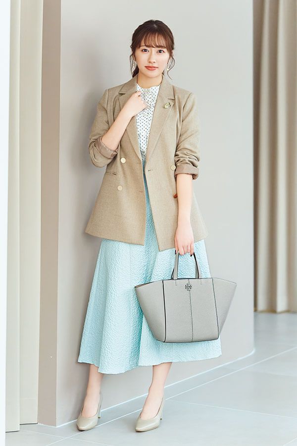 爽快な寒色はオフィスウケも抜群。スカートが主役の日はバッグと靴を同色でまとめて。