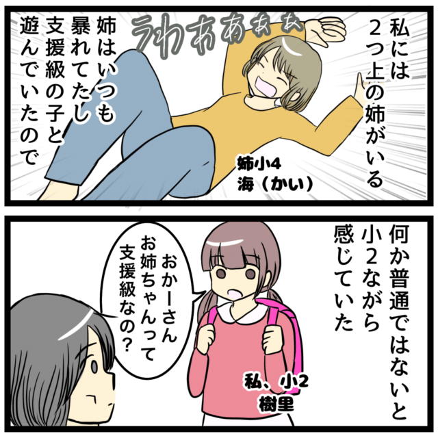 2児のママで、実話を元にした漫画を描いているゆーとぴあさんから、発達障害の姉がいる女の子のお話です。小学2年生の樹里ちゃんには小学4年生の姉・海ちゃんがいます。海ちゃんは発達障害で、お母さんは海ちゃんの育児に疲れていて・・・。