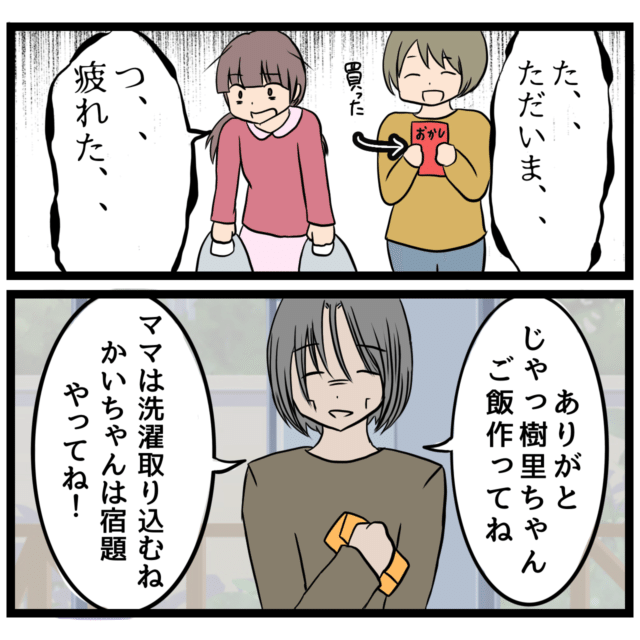 「ありがと。じゃっ樹里ちゃんご飯作ってね。ママは洗濯取り込むね。海ちゃんは宿題やってね!」