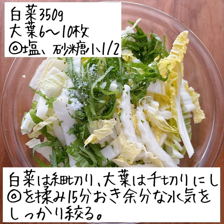 白菜は細切りにし、大葉は千切りにする。◎を揉み混ぜ、15分おき水気をぎゅっとしっかり絞る。