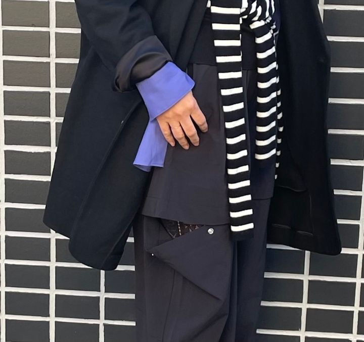 「普段のジャケットスタイルもスポーティな素材やアイテムとMIXしてアクティブなスイッチをオンするのが今の気分。ボーダーを取り入れたいけれど、今は着るより、ウエストマークとして巻くくらいの方がちょうどいい。マニッシュでスポーティなウエアに対して白ソックスとメリージェーンで少し少女感をプラスして、アンバランス感を表現してみました」