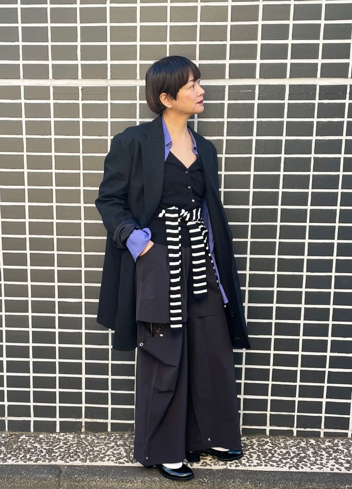 DÅWNの2WAYパンツ、REVERBERATEのジャケット、GOOD PEOPLE GOOD STITCHING GOOD PRODUCTのVネックカーディガン、OVERCOATのシャツ、MADISONBLUEのボーダーニット、中に着たFUMIKA_UCHIDAのレースボディースーツ、A.P.C.のメリージェーンシューズ、MOON TREE PLANETのソックス、MAYUMI MURASAWAのピアスは本人私物