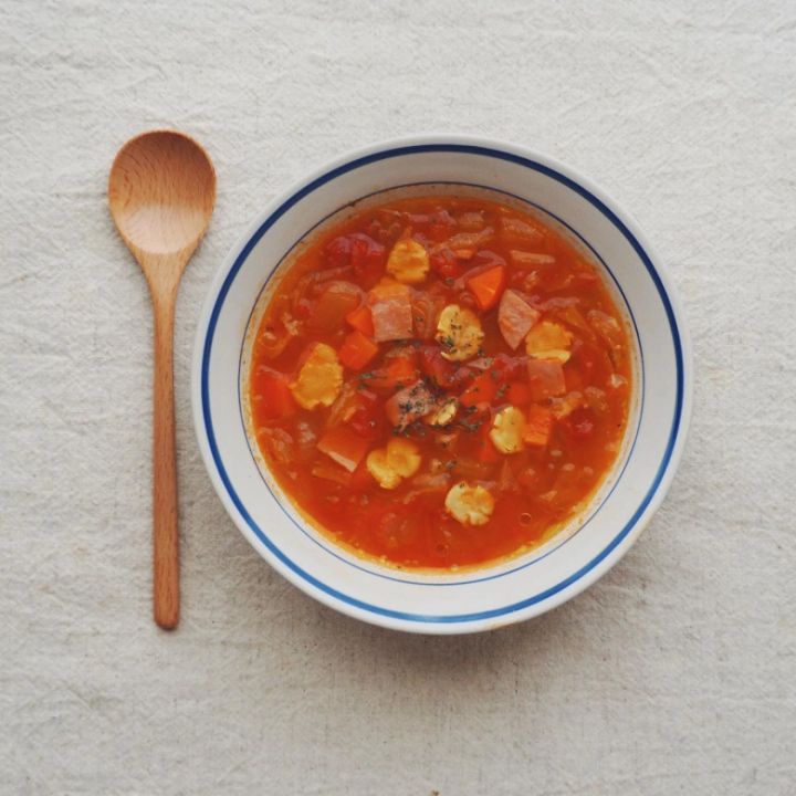 たくさんの野菜を煮込んだミネストローネは、トマトの酸味がカレードリアによく合います。どんな野菜でも合うので、冷蔵庫の残り野菜を片付けるのにも役立ちますよ。