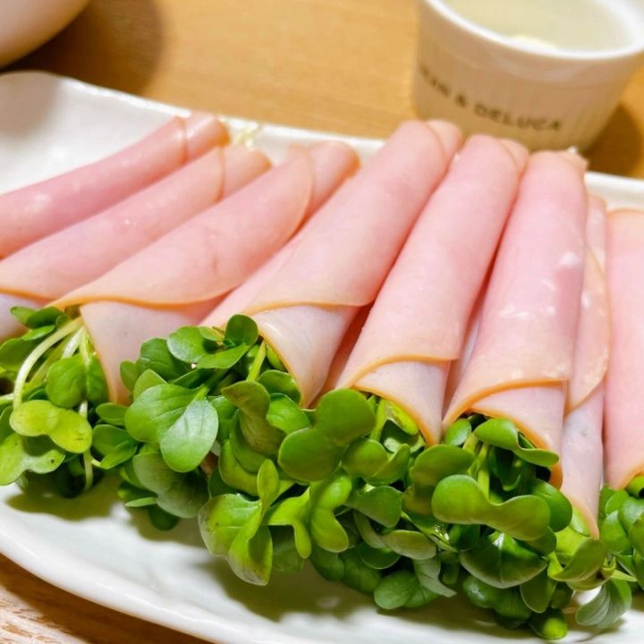 かいわれ大根をハムで巻くだけの簡単副菜は、もう一品ほしいときにぴったり。こってりめのカレードリアの味付けとの相性も◎です。マヨネーズやチリソースをつけて食べてくださいね。