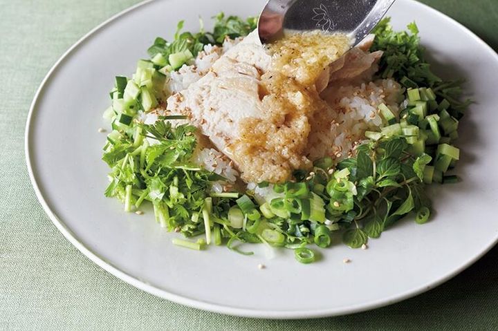 炊き上がったら鶏肉を取り出す。ご飯全体を混ぜて器に盛り、鶏肉は幅6~8mmのそぎ切りにしてご飯にのせ、胡麻を全体にふる。わけぎ、④をあしらい、バター生姜ソースをかける。