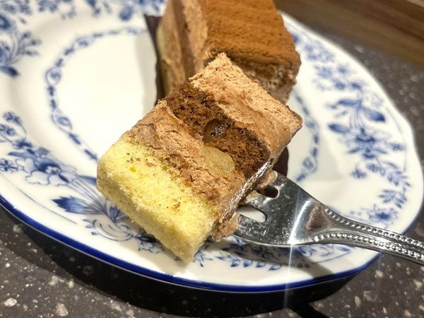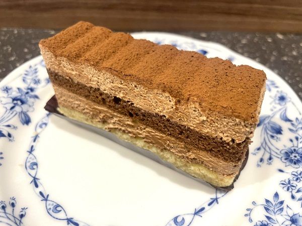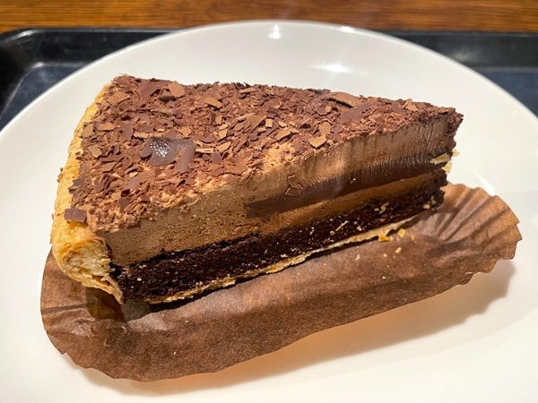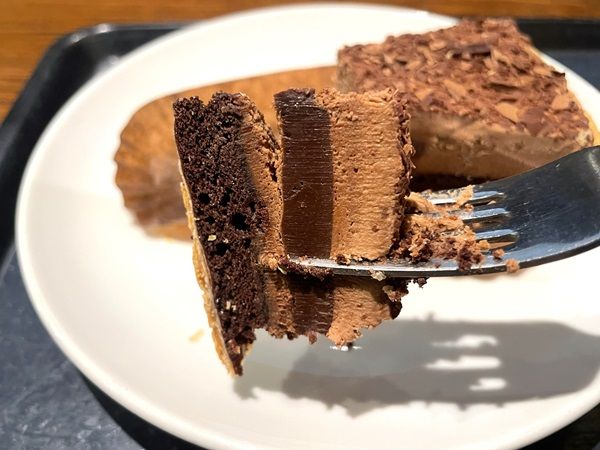 ひと口食べると、チョコレートクリームはなめらかさとコクがあってかなりおいしいです。そのあとに軽い口当たりのビターでしっとりとしたココア生地と、意外と甘さ控えめですっきりとしたチョコレートムースが続きます。