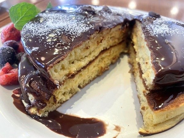 焼きたてのホットケーキ全面に、温かいチョコソースがぜいたくにたっぷりとかかっています。