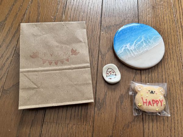今回私が購入したのは、かわいいクッキーと、海柄のレジンのコースター、空ちゃんそっくりな箸置きの3つです☆