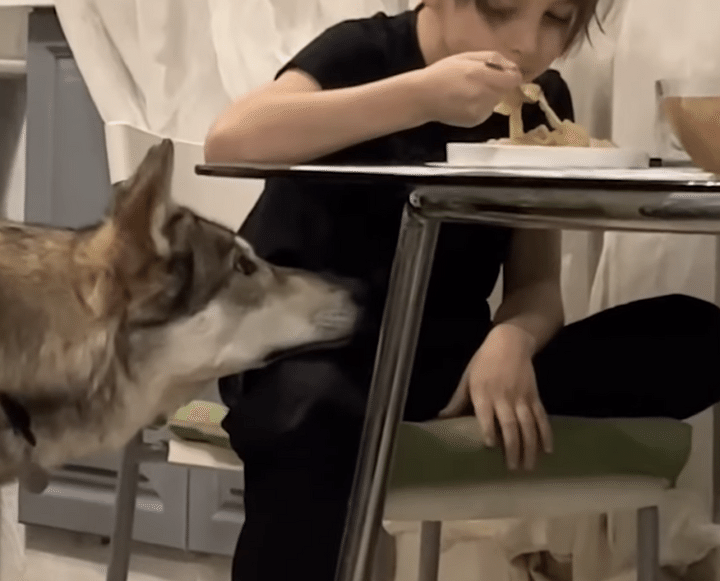 ハスキー「ごはんいいなぁ、おいしそうだなぁ」男の子に上目遣いでアピールする作戦!