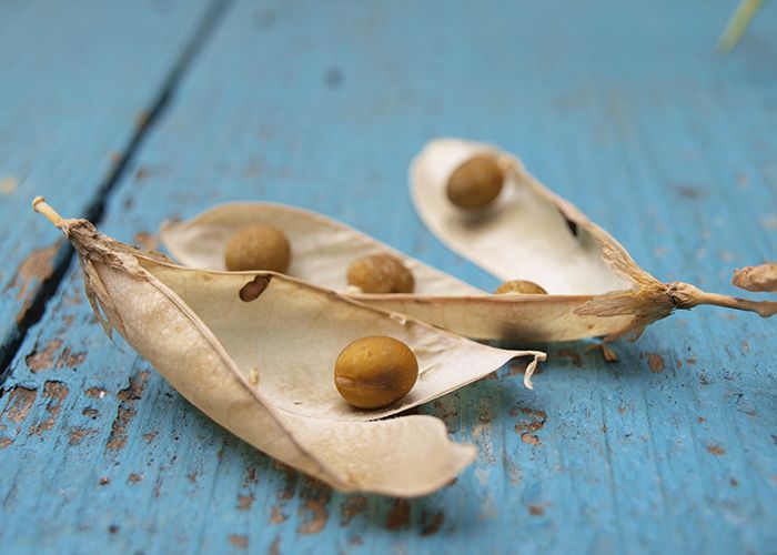 その後、実が膨らみはじめるとスナップエンドウのように。さらに実が膨らむと、グリーンピースになります。暑さに弱いエンドウは、夏になれば自然に枯れます。枯れた後に鞘を開いてみると、元の姿であるエンドウ豆ができていました。
