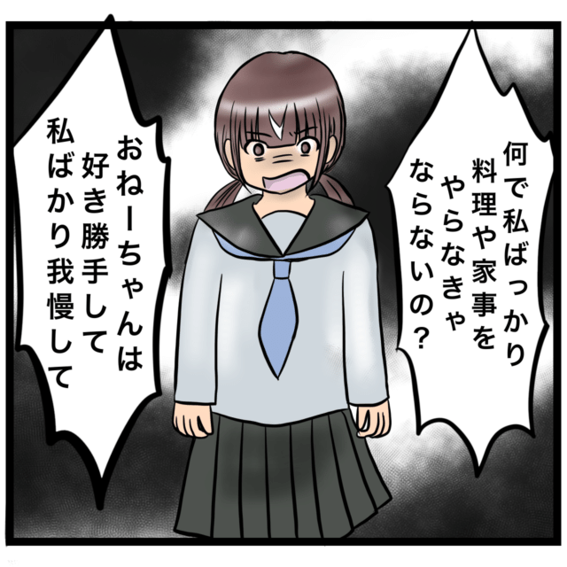 「何で私ばっかり料理や家事をやらなきゃならないの?おねーちゃんは好き勝手して私ばかり我慢して」
