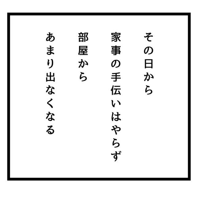 その日から、樹里ちゃんは家事の手伝いをやらなくなり、自分の部屋からあまり出て来なくなりました・・・。