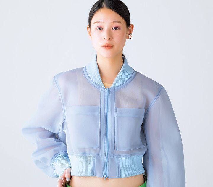 涼しげなアイスブルーのシアーブルゾン。コンパクトな丈感も今年らしさの鍵に。¥58,300(フミエタナカ/ドール TEL:03・4361・8240) リング(セット)¥20,240(バルブス/ズットホリック)