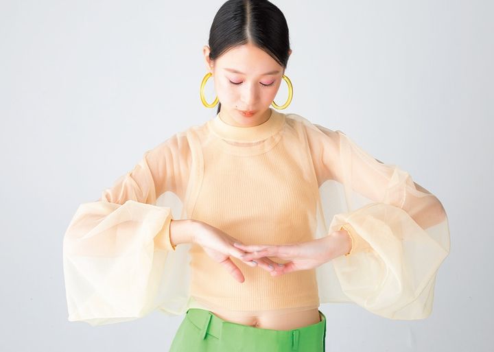 袖はボリューミー、丈は短めに設定し、メリハリのある一着に。トップス¥24,300 中に着たタンクトップ¥8,800(ハイク/ボウルズ TEL:03・3719・1239) ピアス¥4,510(インク・アンド・アロイ/ズットホリック)