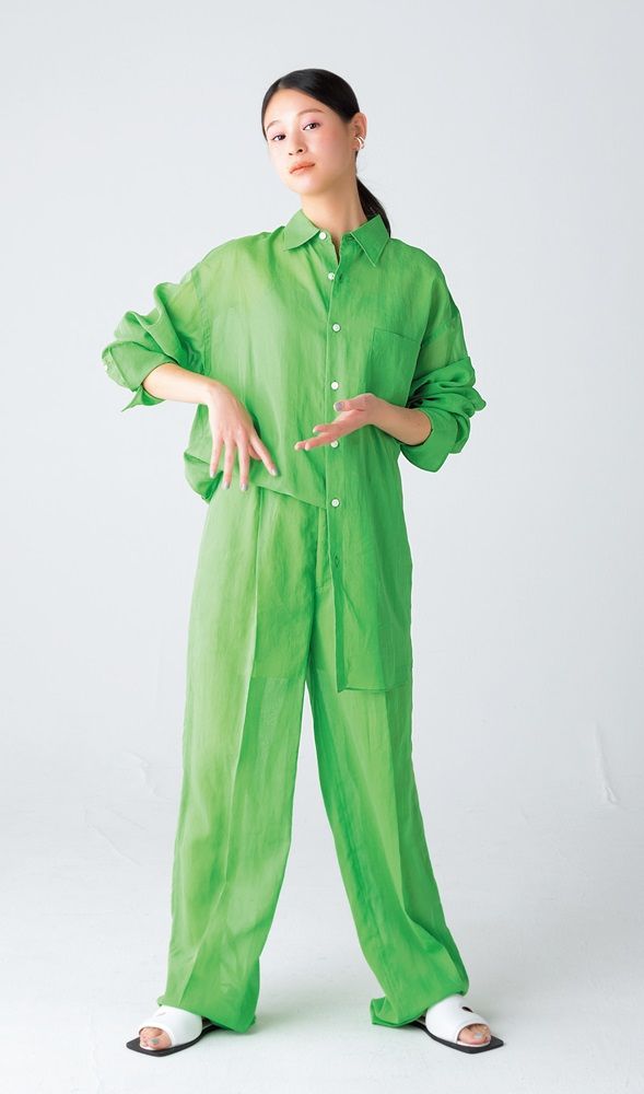美しいグリーンに心惹かれるシャツとパンツをセットアップで。極細のコットン糸を強撚して織り上げられた生地は、上品な透け感と、風になびく柔らかな質感が持ち味。パンツはセンタープレスが施され、リラックス感のあるシルエットながらも、都会的なムードを醸し出す。シャツ¥33,000 キャミソール¥9,900 パンツ¥44,000(以上オーラリー TEL:03・6427・7141) イヤカフ¥18,040(バルブス/ズットホリック) サンダル¥41,800(チノ/モールド TEL:03・6805・1449)