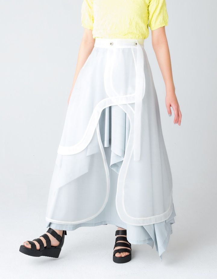 クリア素材と、アシンメトリーな形に注目。スカート¥66,000 中にはいたスカート¥69,300(共にウジョー) トップス¥40,700(サヤカ デイヴィス/ショールーム セッション TEL:03・5464・9975)
