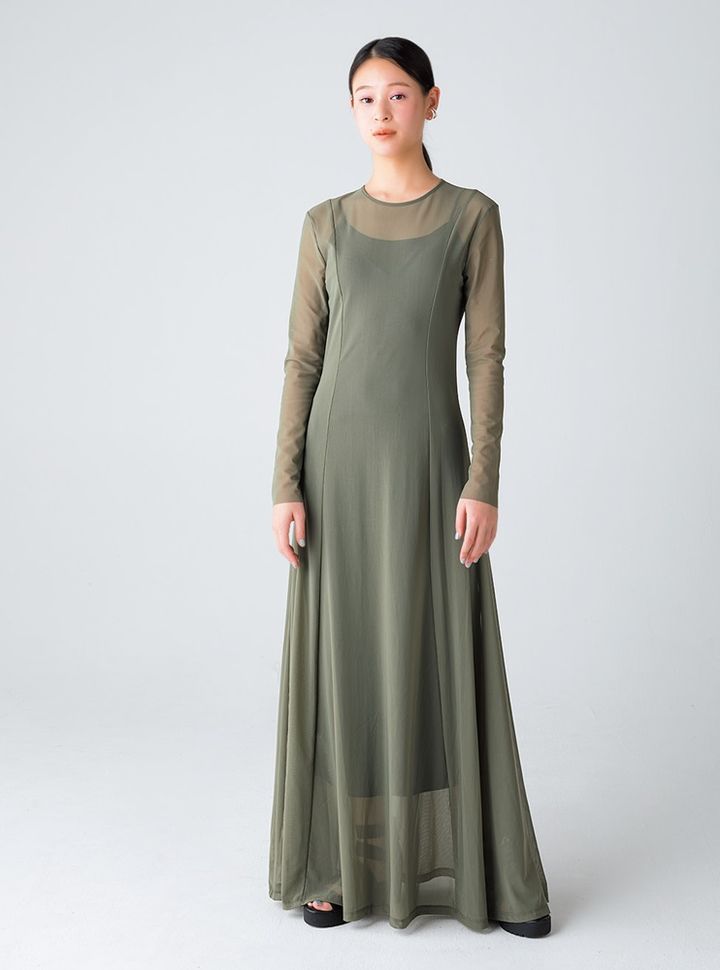 落ち感があり、歩いても美しいラインに。ワンピース¥35,200 中に着たキャミソールワンピース¥60,500(共にサムソ サムソ/エイト TEL:03・4530・3240) サンダル¥26,400(モリーニ/ジャック・オブ・オール・トレーズ プレスルーム TEL:03・3401・5001)