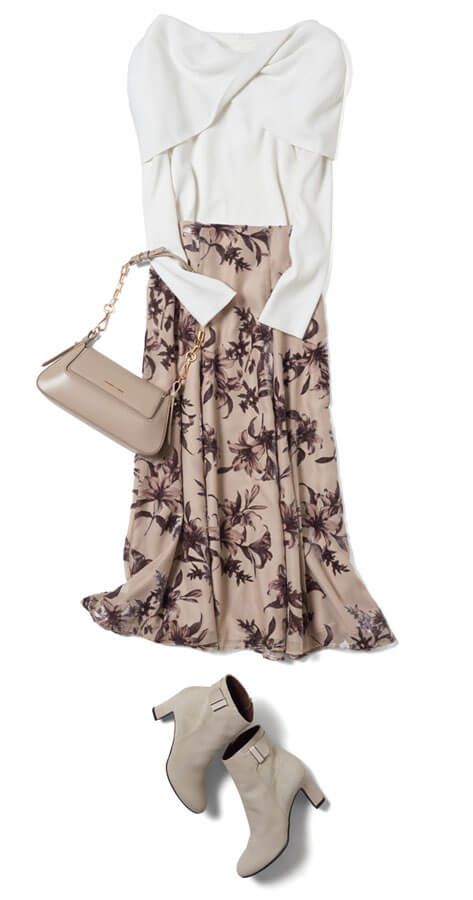 ツイストデザインがほんのりセクシーなニットは今季のトレンドアイテム。落ち着いた色合いの花柄スカートでまとめれば、大人の女性らしさが際立ちます。鎖骨がキレイに映える広めのVラインで、顔まわりがすっきり見えるのもうれしい。