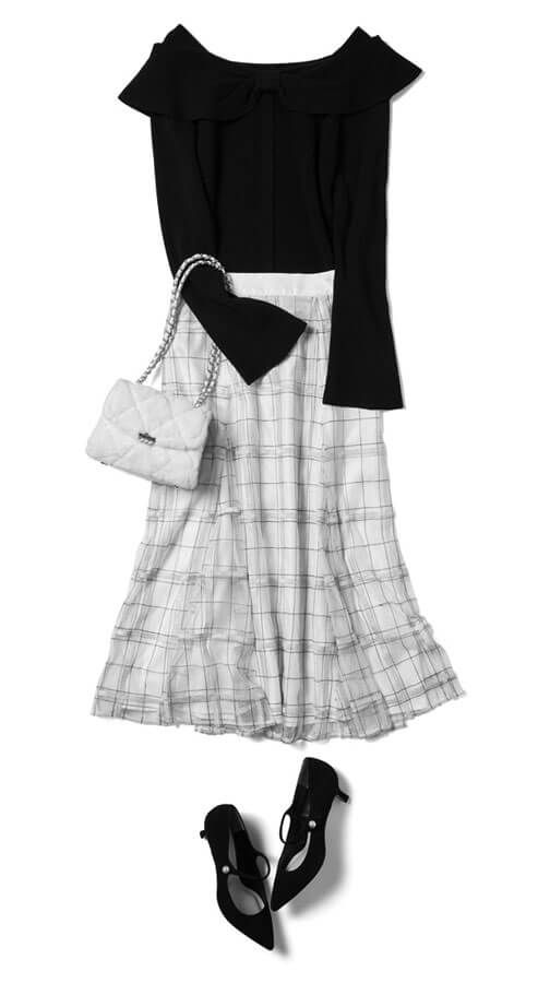 シックなモノトーンコーデで品格を高めつつ、透け感のあるふんわりスカートで愛らしさも忘れずに。フィット感のあるリブニットならウエストまわりがもたつく心配もなく、立っても座っても美シルエット♡