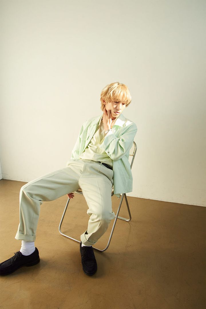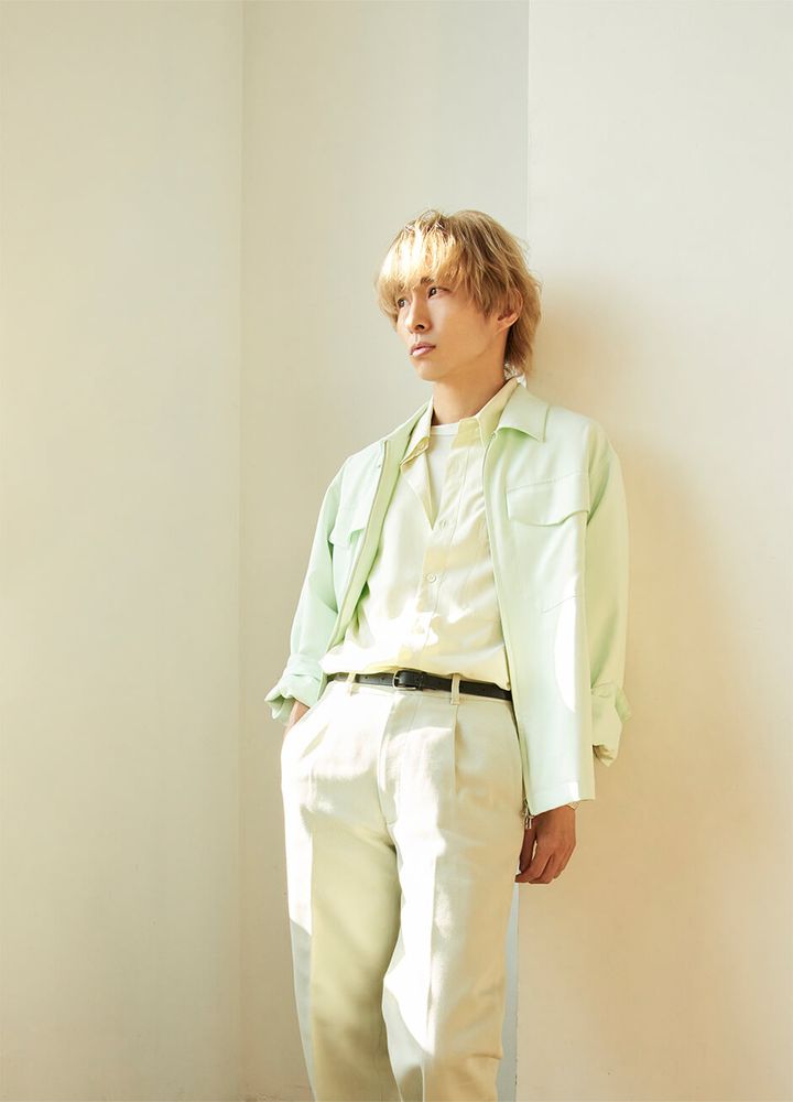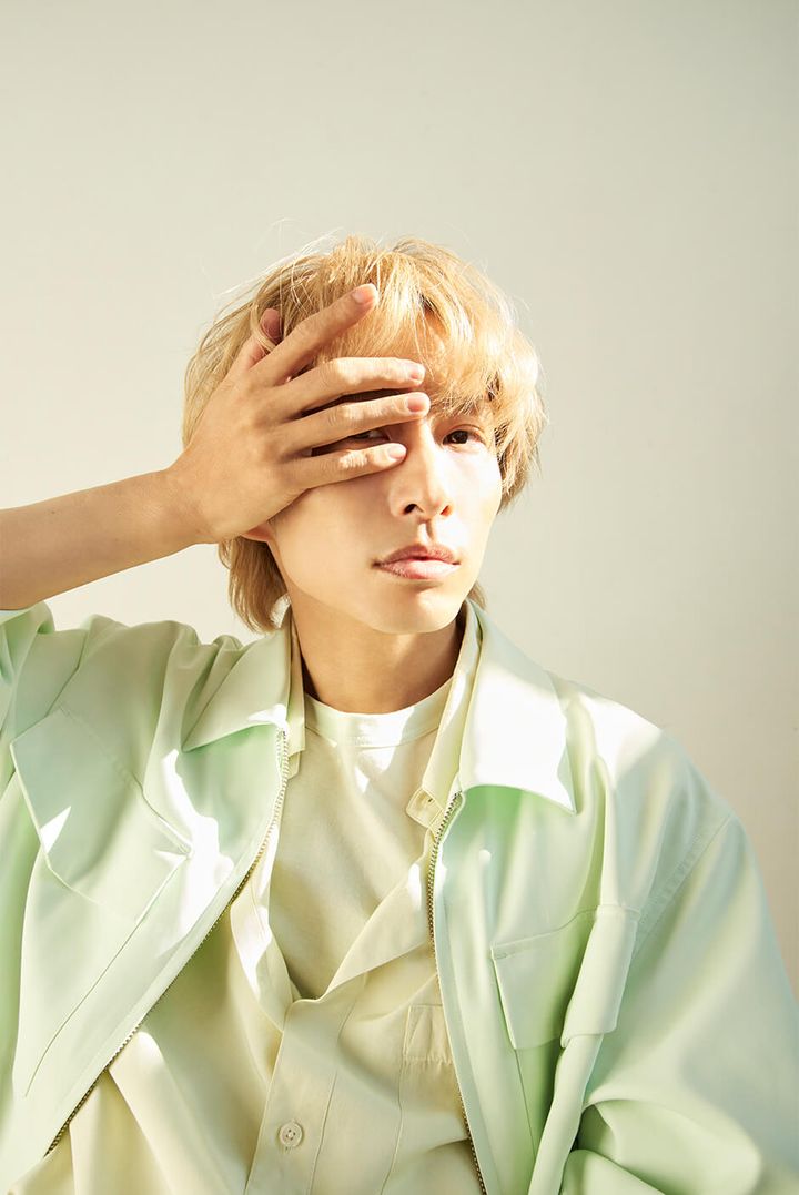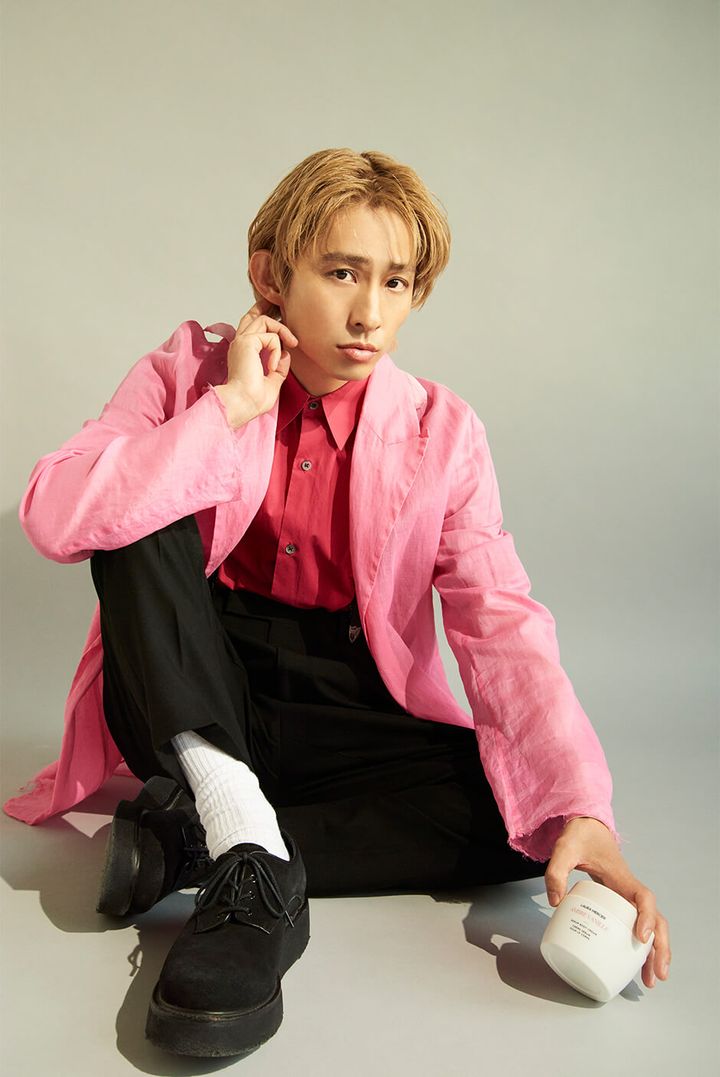 「すごく自然に、くすみを飛ばしてくれる」と彼も言う通り、素肌の美しさを引き立てたミニマムなメイクで、フレッシュなムードを漂わせている。