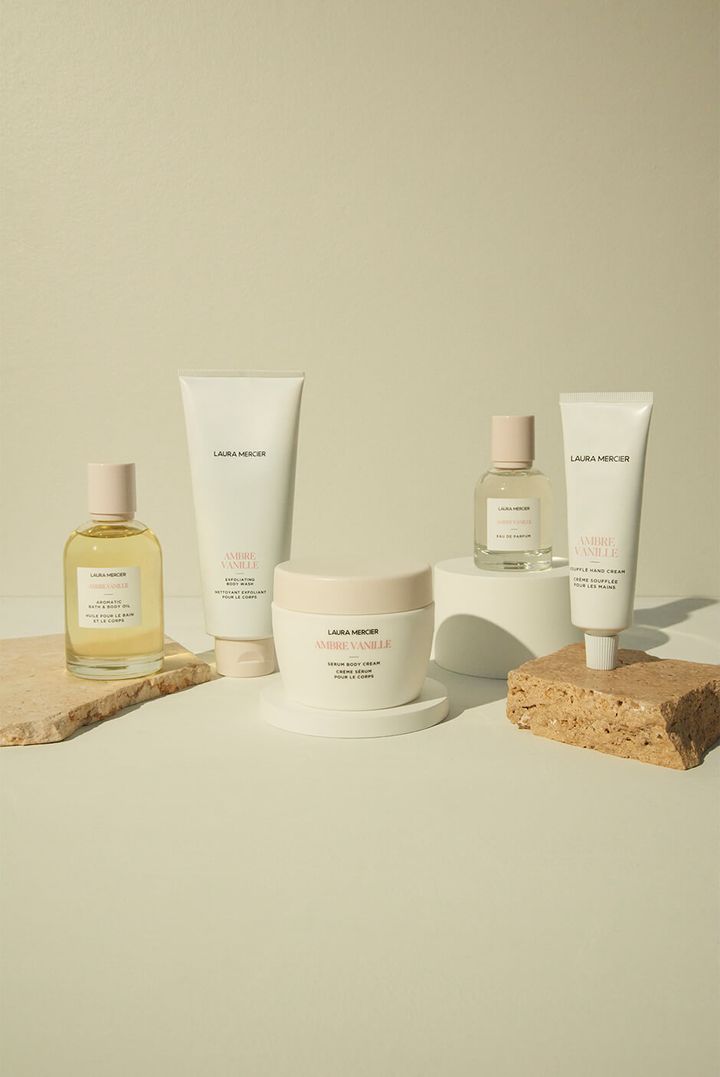from left - Aromatic Body Oil ¥10,780, Exfoliating Body Wash ¥7,150, Serum Body Cream ¥10,340, Eau de Parfum ¥12,870, Souffle Hand Cream ¥5,060