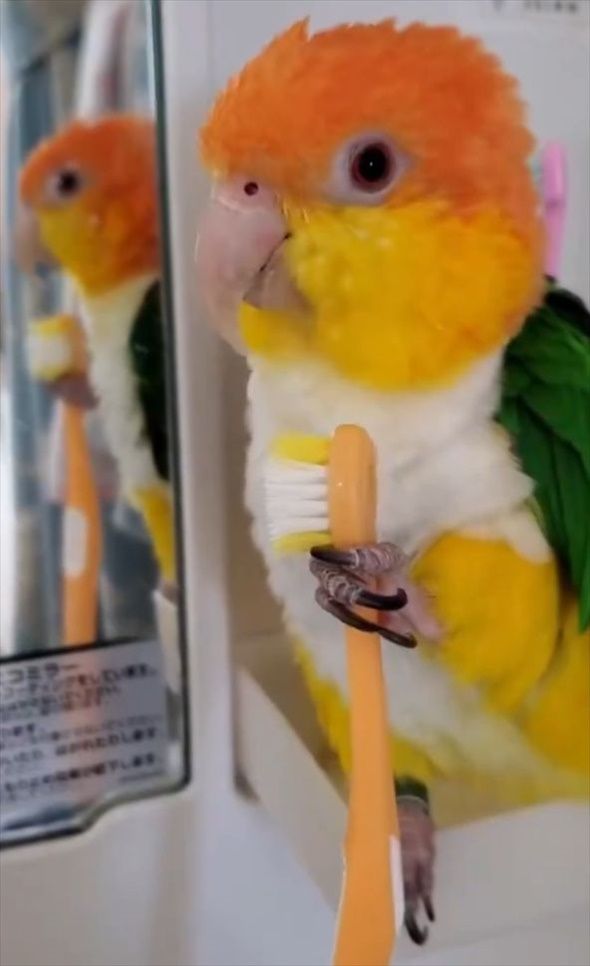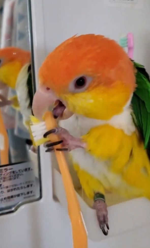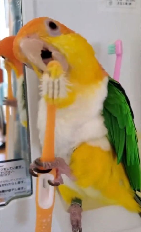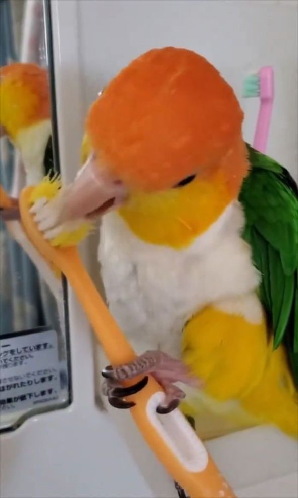 器用にクチバシを歯ブラシで磨いているシロハラインコ。 ところが、その歯ブラシというのは自分用に用意されたものではなく・・・、飼い主さんの歯ブラシなんだとか。