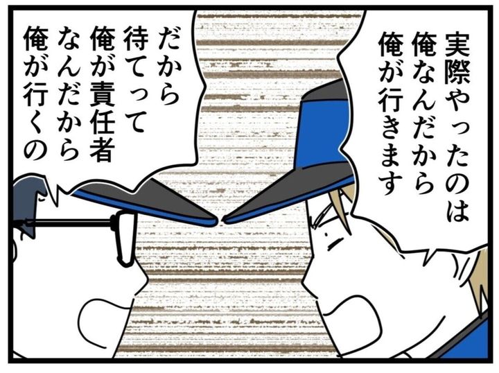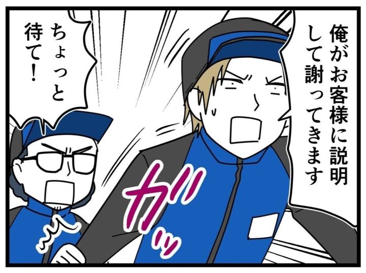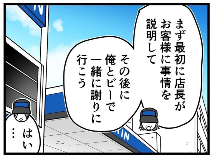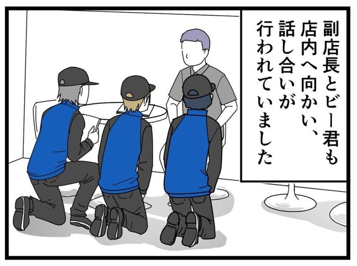 事故を起こしたビー君は「お客様に謝ってきます!」と今にも走り出す勢いです。「責任者だから俺が行く」とそれを止めたのは店長でした。どちらが謝罪に行くかで再び言い争いになりますが、副店長の言葉でビー君は落ち着きを取り戻しました。