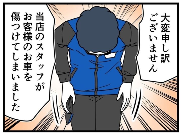 お客さまに謝罪をし、話をした後にお客さまは代車で帰って行きました。後になって副店長から話を聞くと「すごかった」と一言感想を言われます。事故の様子を見ていたというお客さま。お客さまはスタッフたちに何を言ったのでしょうか。