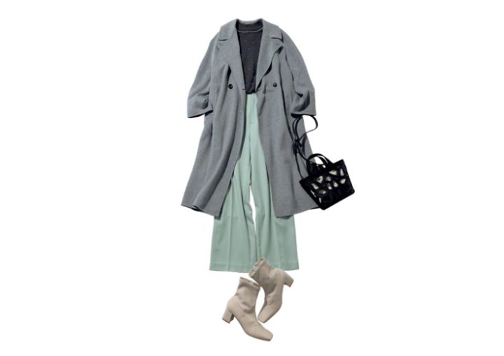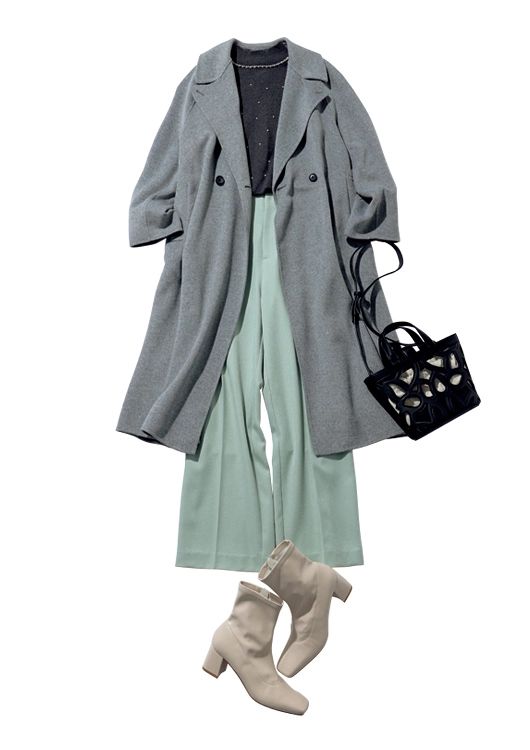ウールコート¥29,000/PLST、カラーパンツ¥6,589/VIS、パール付きニット¥6,590、カットワークバッグ¥5,990/ともにZARA(ザラ)、ショートブーツ¥3,990/GU