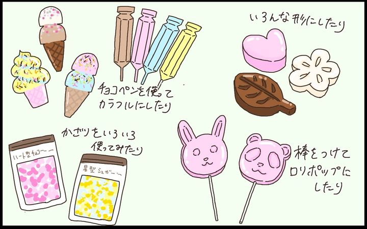 小さい子どもでも簡単にできるし、好きな型やトッピングが使えて楽しいし、味についても市販の板チョコを溶かして固めただけなので失敗はほぼないし。