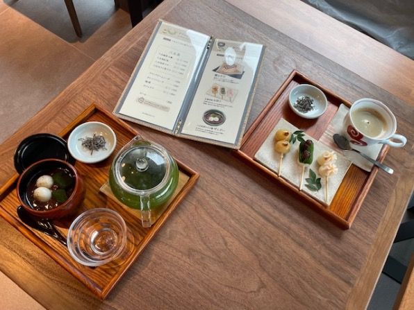 こちらは甘味のカフェセット(お団子かぜんざい+お好きなドリンク、足湯タオルレンタル)1800円 お団子のセット(右)は、定番のみたらしや八女抹茶味に季節ごとに変わる団子の3本。写真の飲み物はホットコーヒーです。 八女抹茶わらび餅ぜんざいは、八女茶を使ったわらび餅ともちもち団子入りの特製ぜんざいです。夏には冷たいぜんざいになるそう。写真の飲み物は八女茶の玉露。緑がとても鮮やかで美しい。