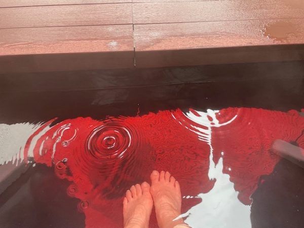取材の日は小雨で肌寒いお天気でしたが、この絶妙のお湯加減。ぬくぬくでなんとも良い気持ちになりました。目の前の中庭を眺めながらぼ〜〜っとするのは最高です。10分ほどの体験でしたが、全身がほっかほかでじんわり汗もにじむほどでした。ビールも良さそう。