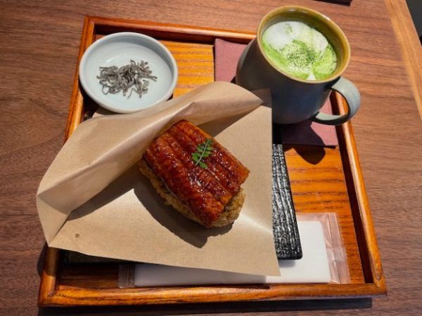 軽食のカフェセット(鰻むすび、お好きなドリンク、足湯タオルレンタル)1800円をいただきました。飲み物は八女抹茶ラテをチョイス。甘くないので、軽食にも合って美味しかったです。