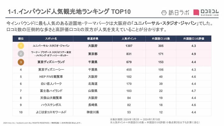 世界の中でも日本は旅行先としての人気がトップクラス。では、外国人旅行者は日本のどこへ行くのでしょうか? 国内最大級のインバウンド総合メディア「訪日ラボ」を運営するmovが発表した「インバウンド人気観光地ランキング」から、「外国人に人気のテーマパークランキングTOP10」を紹介します。