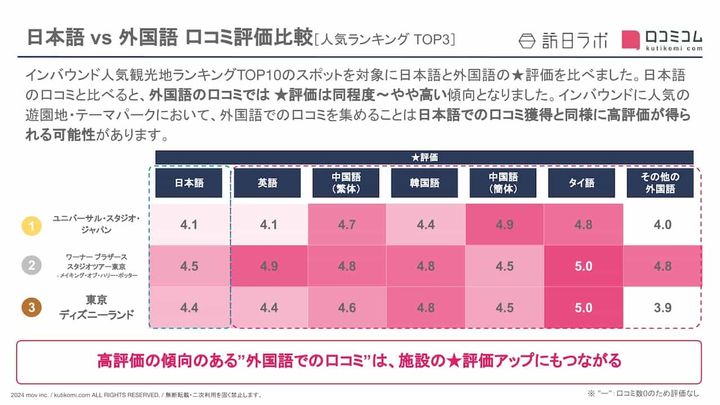 人気観光地TOP10の口コミ評価を言語別に算出。日本語と外国語との評価を比べてみると、ある特徴が見えてきました。日本語の口コミと比べると、外国語の口コミでは ★評価は同程度〜やや高い傾向となっています。
