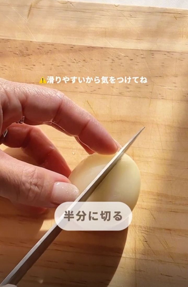 殻がむけたら、凍ったタマゴを包丁で半分にカットします。