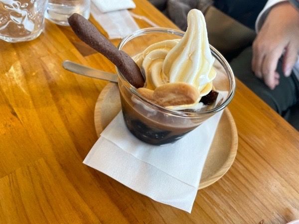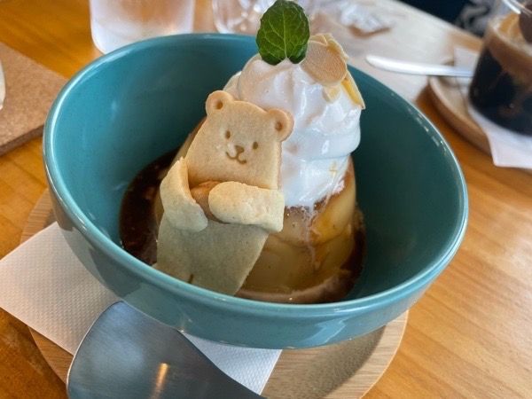 私が頼んだのはソフトクリームとクッキーが添えられたプリン クマさんかな?めちゃ可愛くて食べるのが勿体ないようでした。 プリンは純喫茶のような素朴で食感もしっかりあるタイプで私好み♡ とろりんタイプのプリンより、こういったタイプのプリンが大好きなので頼んで正解でした。
