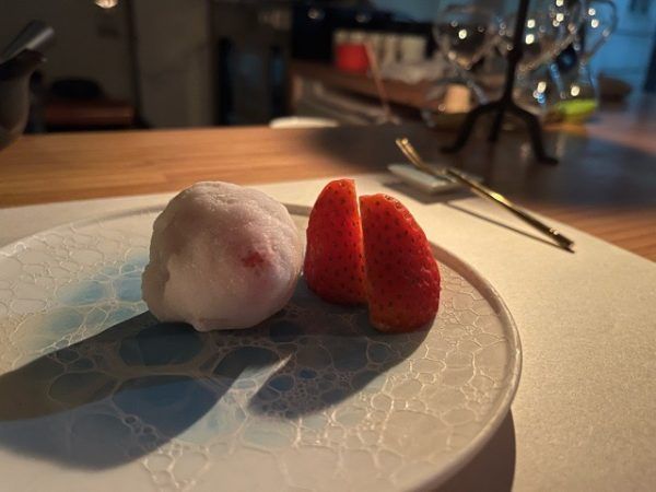 羊羹の後は、いちご大福です! こちらは、2煎目の宇治中煎りほうじ茶と一緒にいただきました。