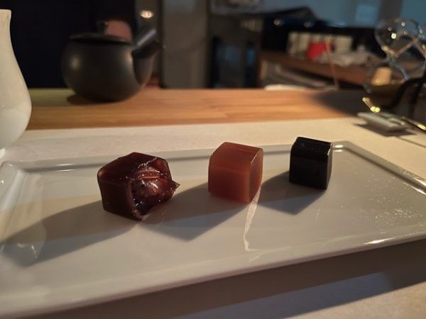 宇治中煎りほうじ茶と一緒に出された菓子は、三種ノ羊羹。
