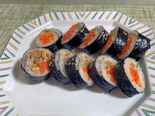 キンパは、日本の海苔巻きに比べてご飯が少なく、野菜などの具材がたっぷり。