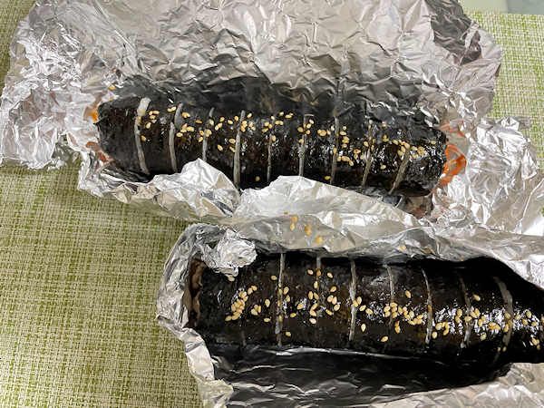 アルミホイールを開けると、海苔とごまの香りがふんわりと…食欲がそそられます。それぞれ、食べやすいように10ピースにカットされています。