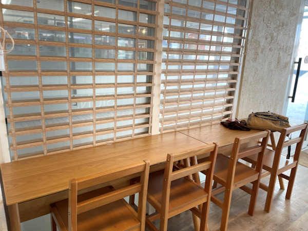 店内はテイクアウトがメインのため、レジ前スペースが広くなっています。ランチタイム11:00-15:00には、イートインも可能となります。カウンター席とテーブル席が、用意されています。