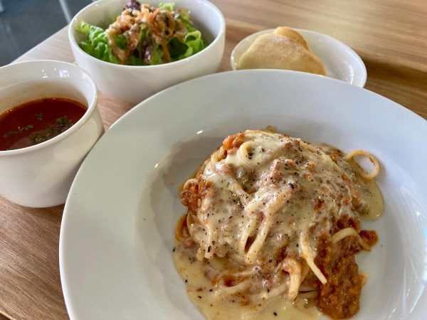 米粉のカヌレなど、スイーツのテイクアウトやドリンクなども魅力的でしたが、お昼時なので看板メニューの「とろ~りチーズのべジボロネーゼパスタ」を注文しました。単品は1,200円、セットはサラダ、スープ、パンが付きます。今回はセットで注文しました。お席はカフェの近くでもくるる内のお席でも大丈夫とのことでした。出来上がったらお席まで運んでくれるとのことでした。